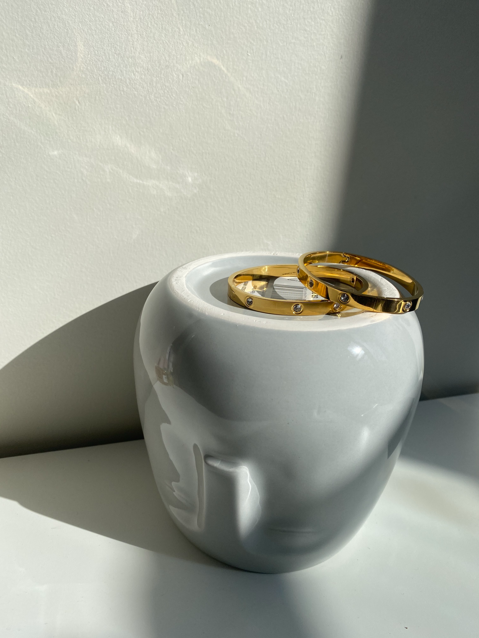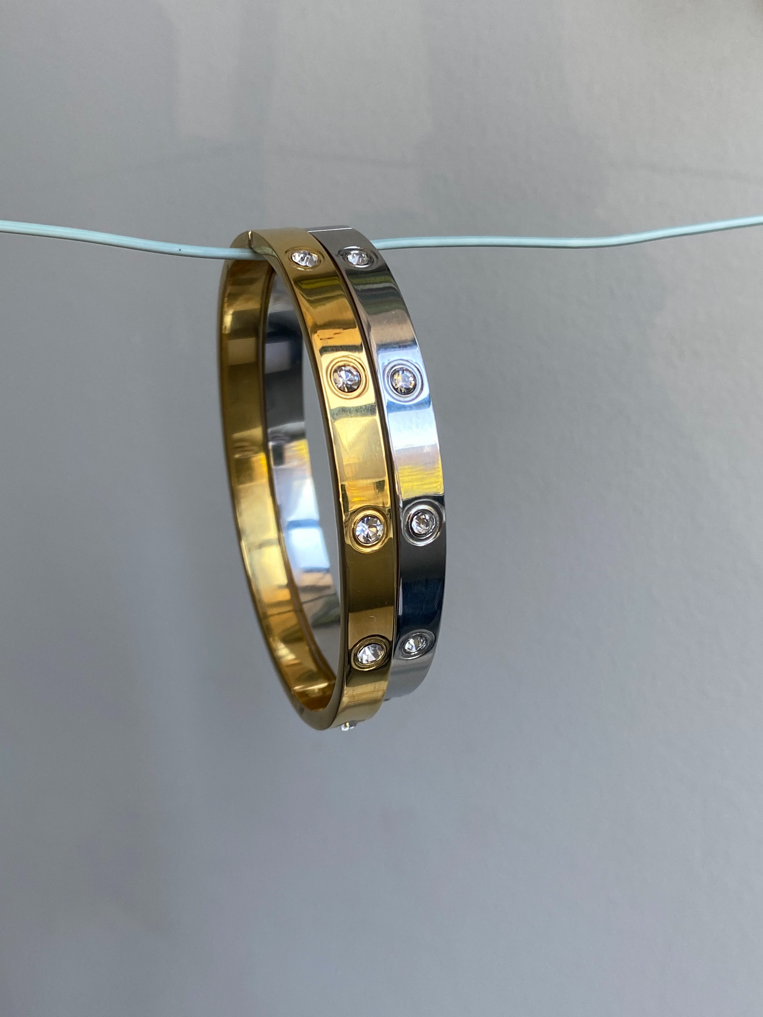 A Classic, high quality bracelet curated for you with love. Encrusted with cubic zirconia, engraved with our logo that gives a classic yet modern touch. So versatile, goes with any outfit or mood. Wear it alone for a simple look or stack up if you're feeling extra bold. Built with hidden safety clasps, which easily overlaps and makes it easier to put it on and take it off.