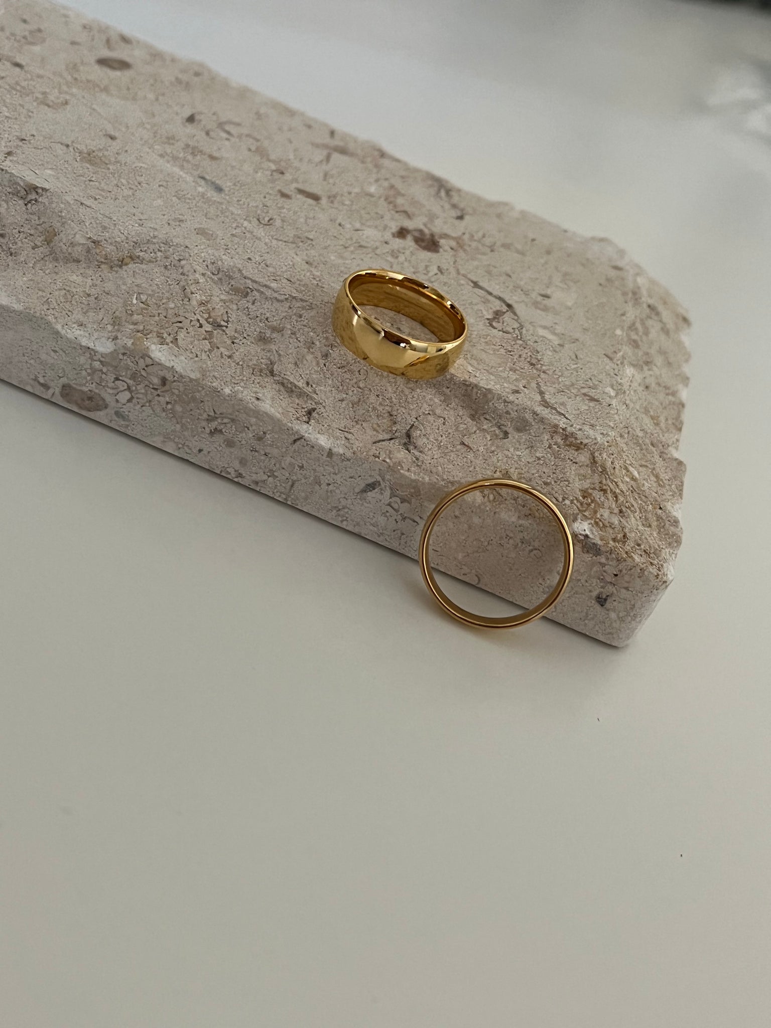 A classic band style ring with a smooth, polished, and sleek surface over its inner band and outer band. Perfect for stacking. Comes in two width sizes.