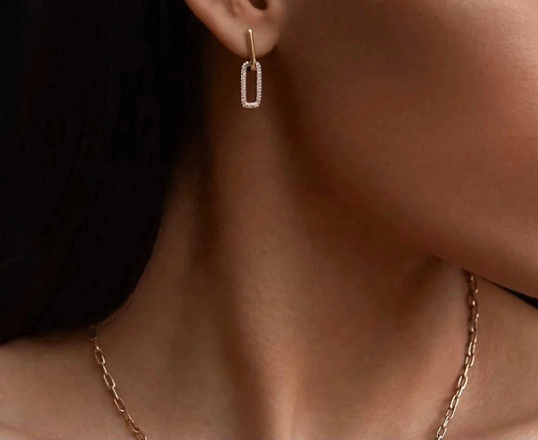 Featuring a sleek pair of paperclip drop earrings. These sparkly earrings dangle gracefully and adds a modern touch to your everyday look. Perfect for the holiday season.
