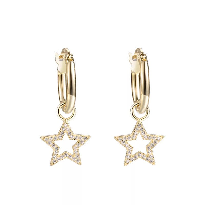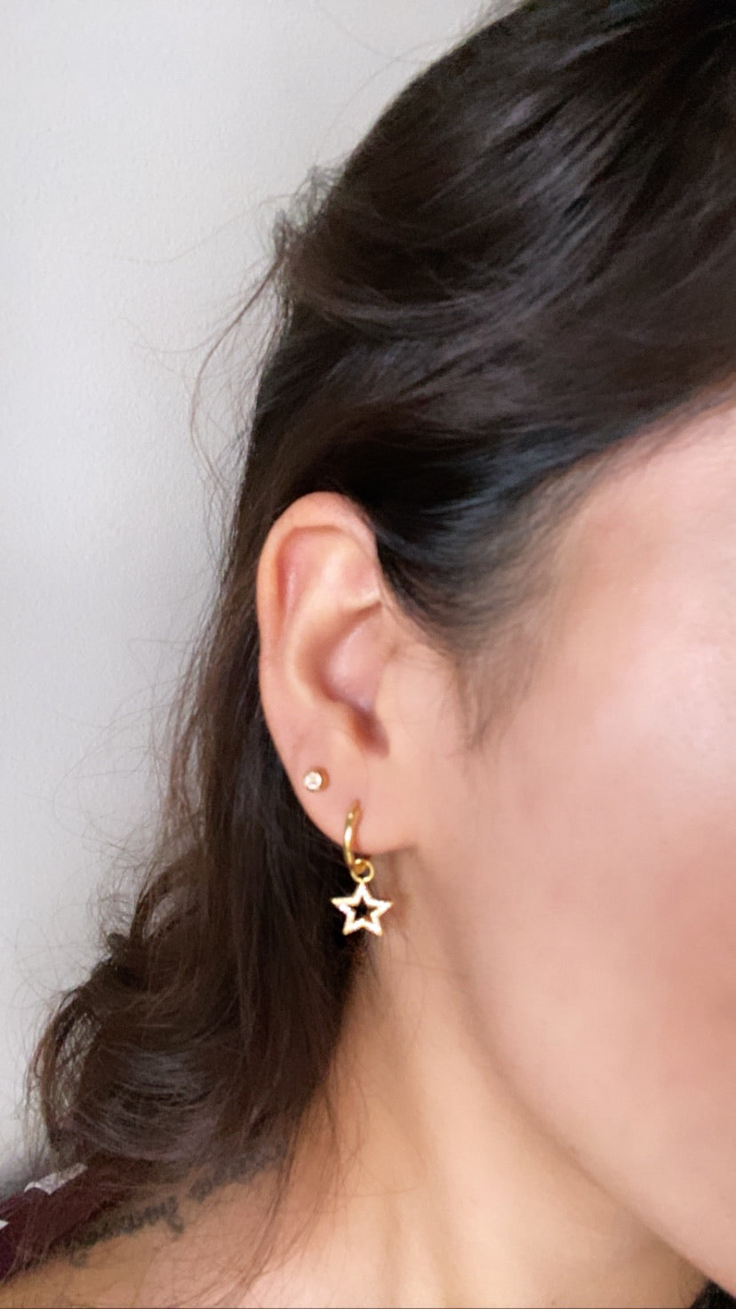 Dainty dangling star charms with a sparkling crystal accent that catches everyone's attention. These shiny pair of earrings are subtle yet adds a fun touch.