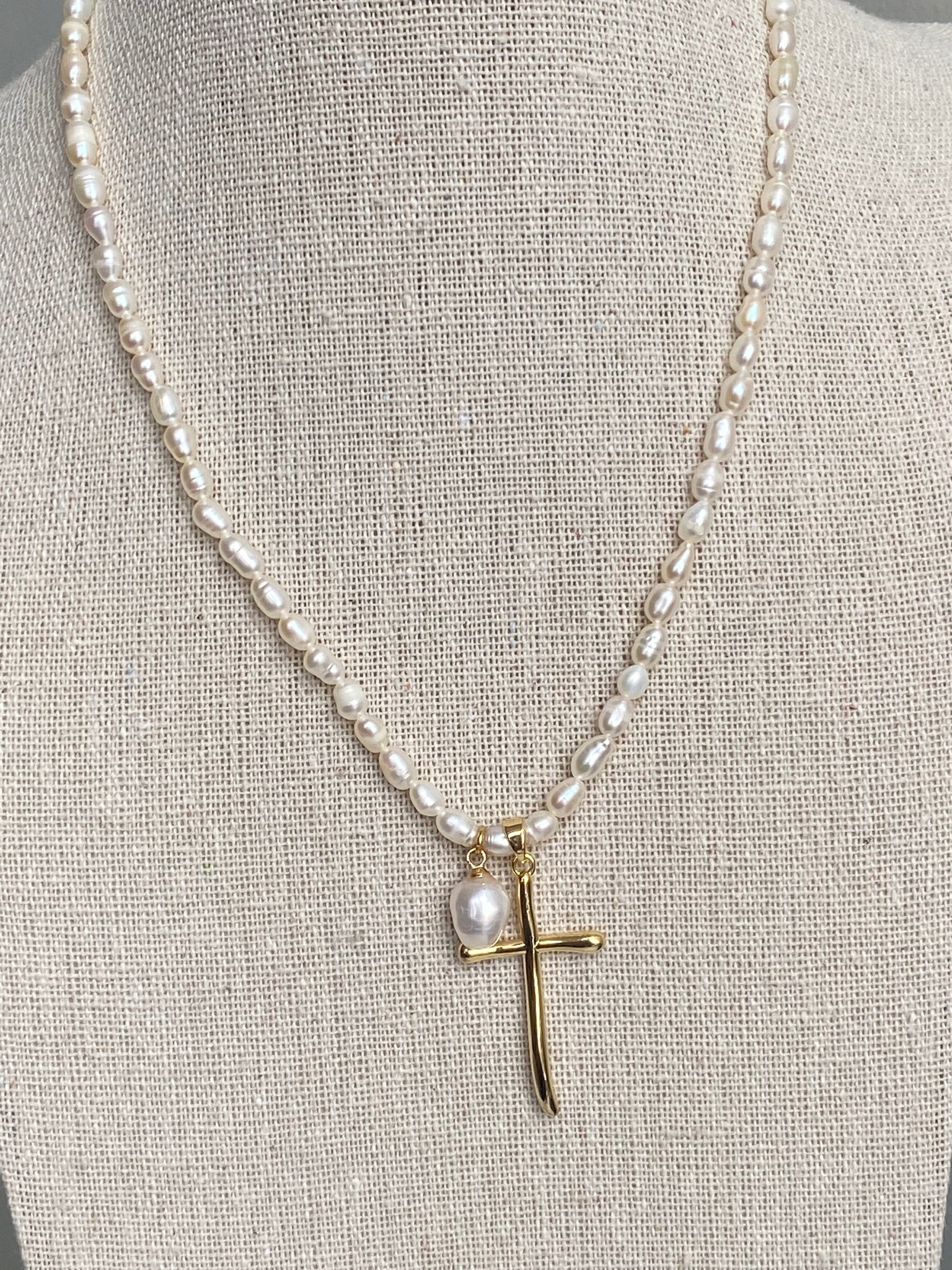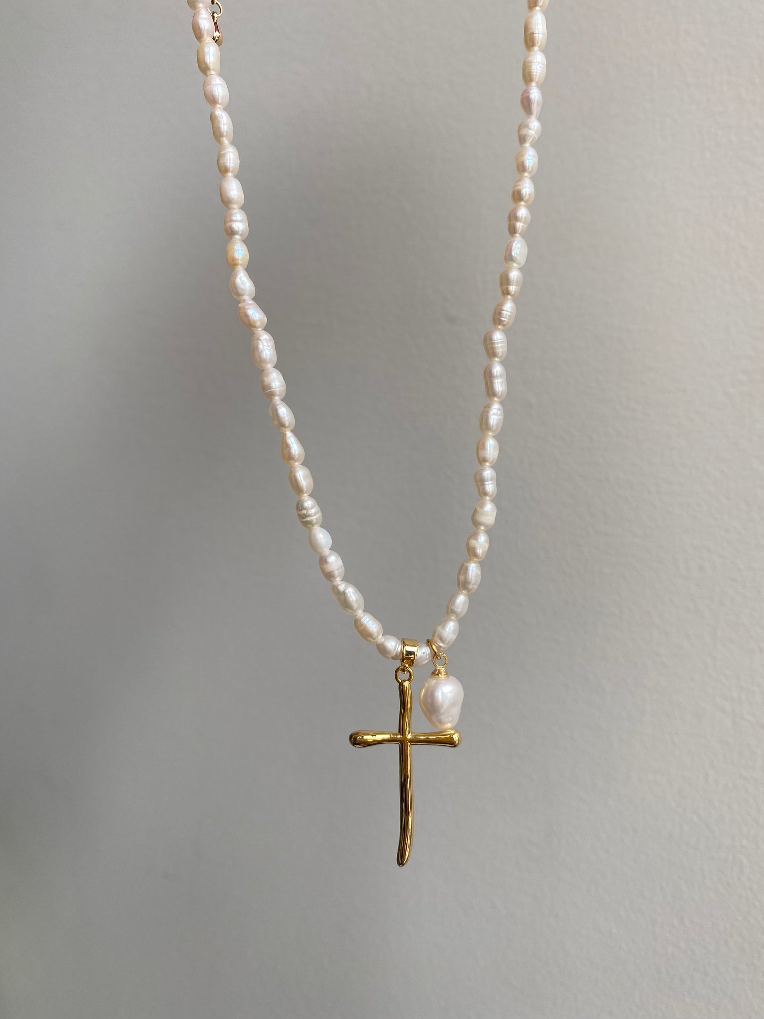 Featuring a classic Pearl Necklace with drop charms you never thought you needed. Curated with freshwater Baroque Pearls and Stainless Steel Cross charm inspired by natural forms which never goes out of style. Perfect for any occasion.