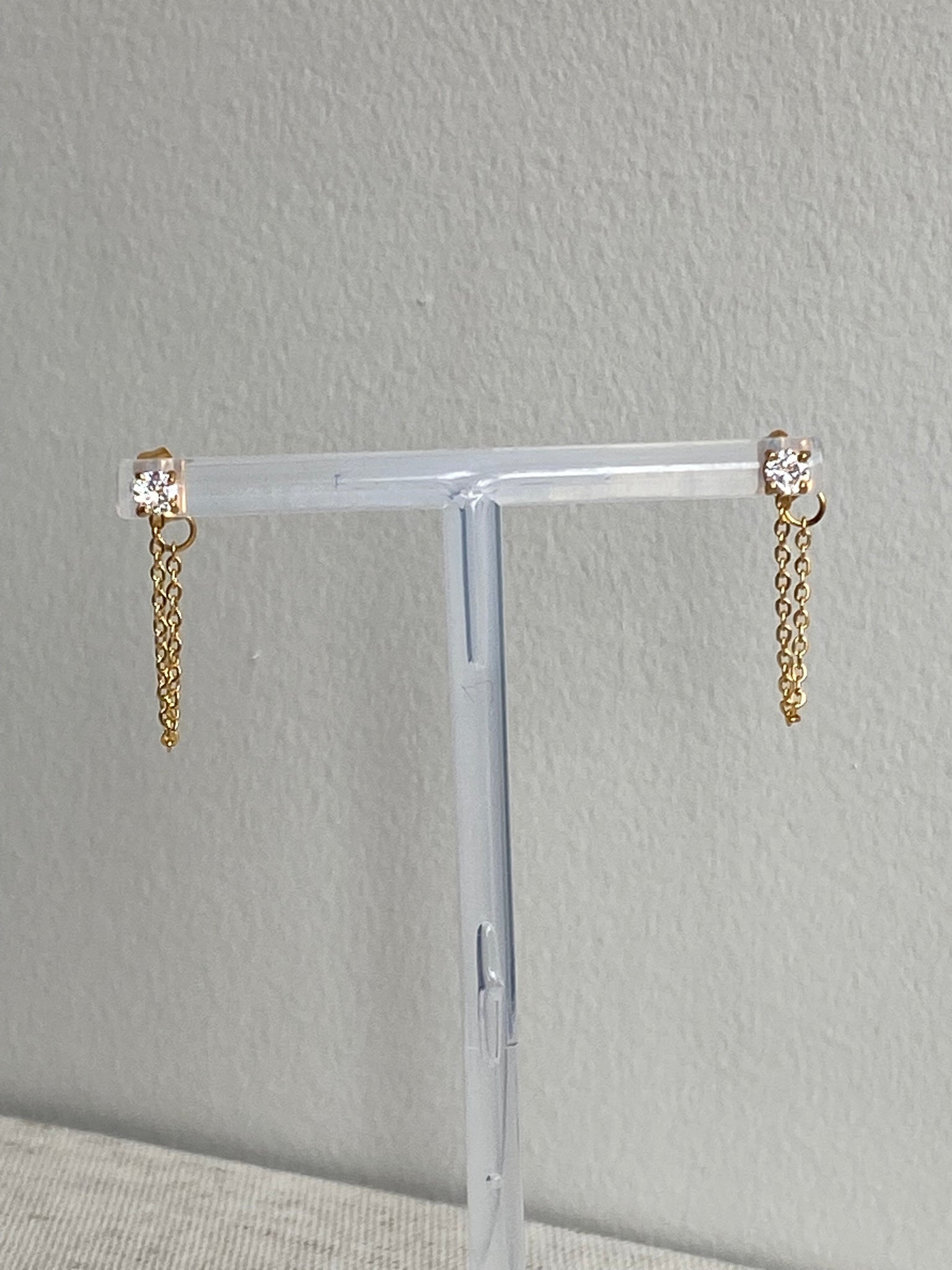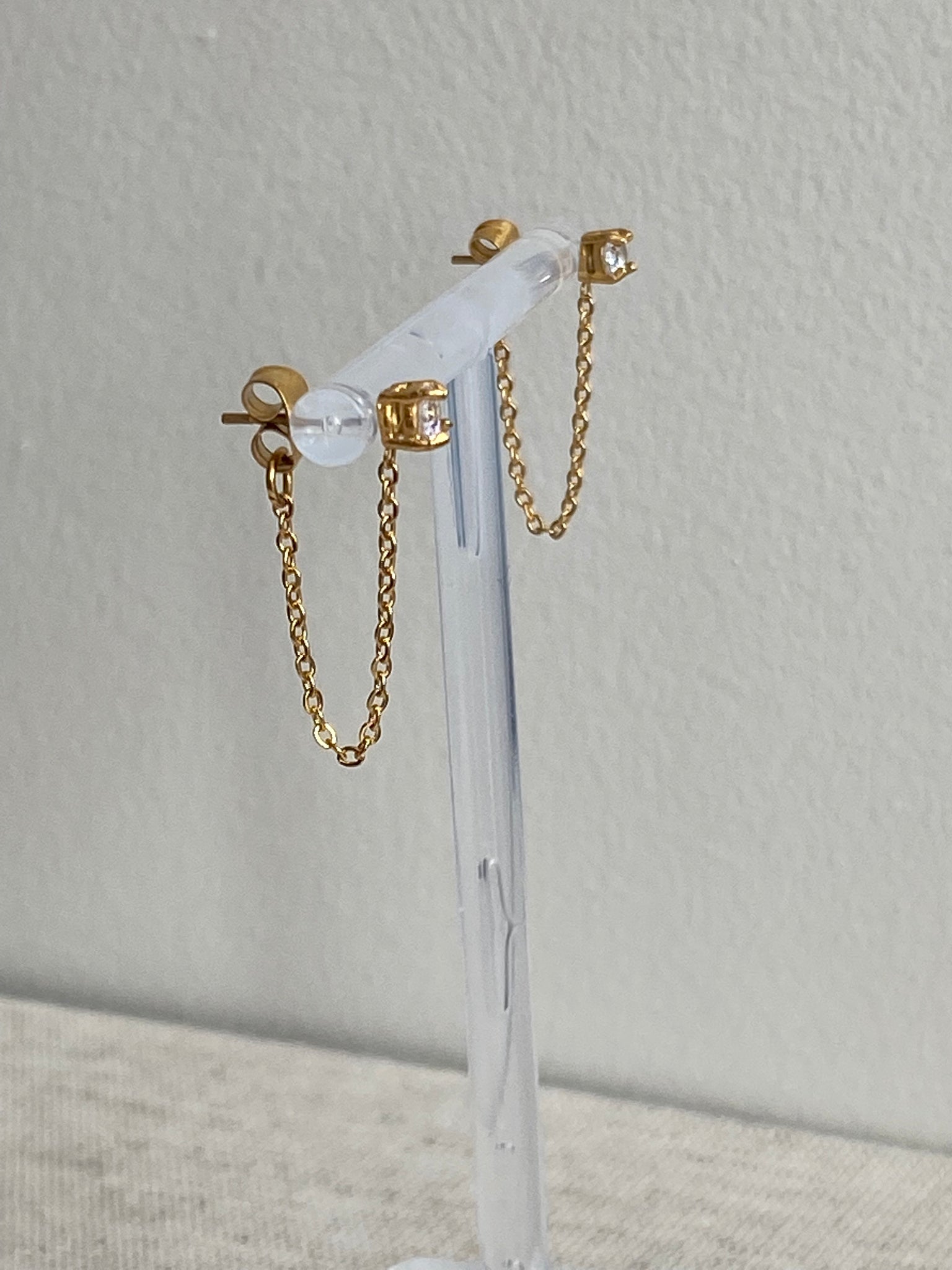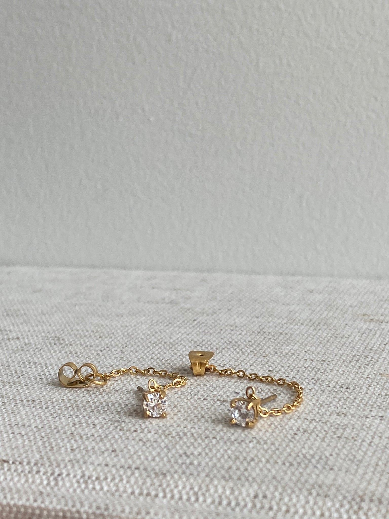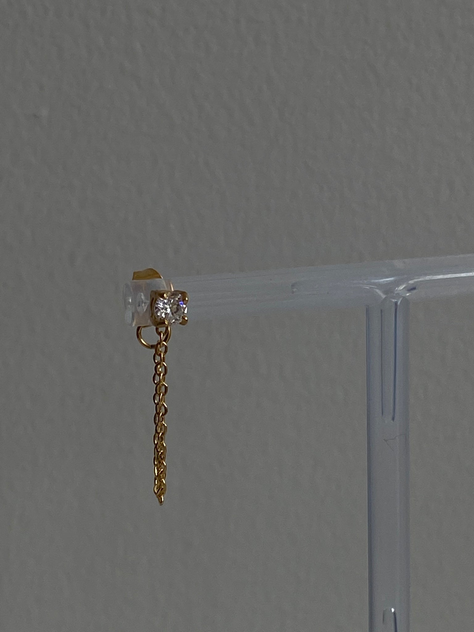 A simple stud, only better! Featuring the everyday classic with a delicate drop chain that fastens behind the ear to add an extra ounce of the unexpected to the everyday piece.