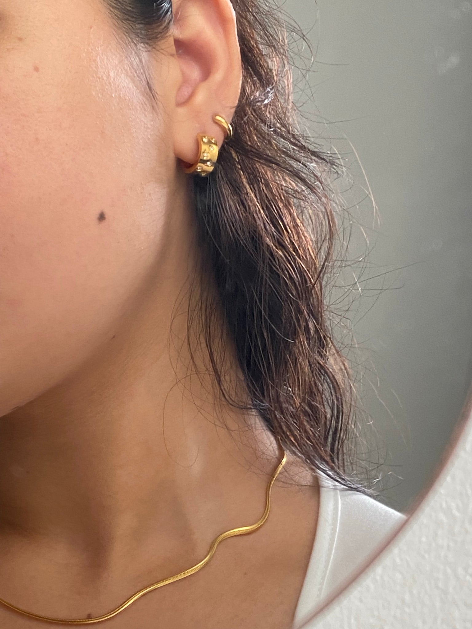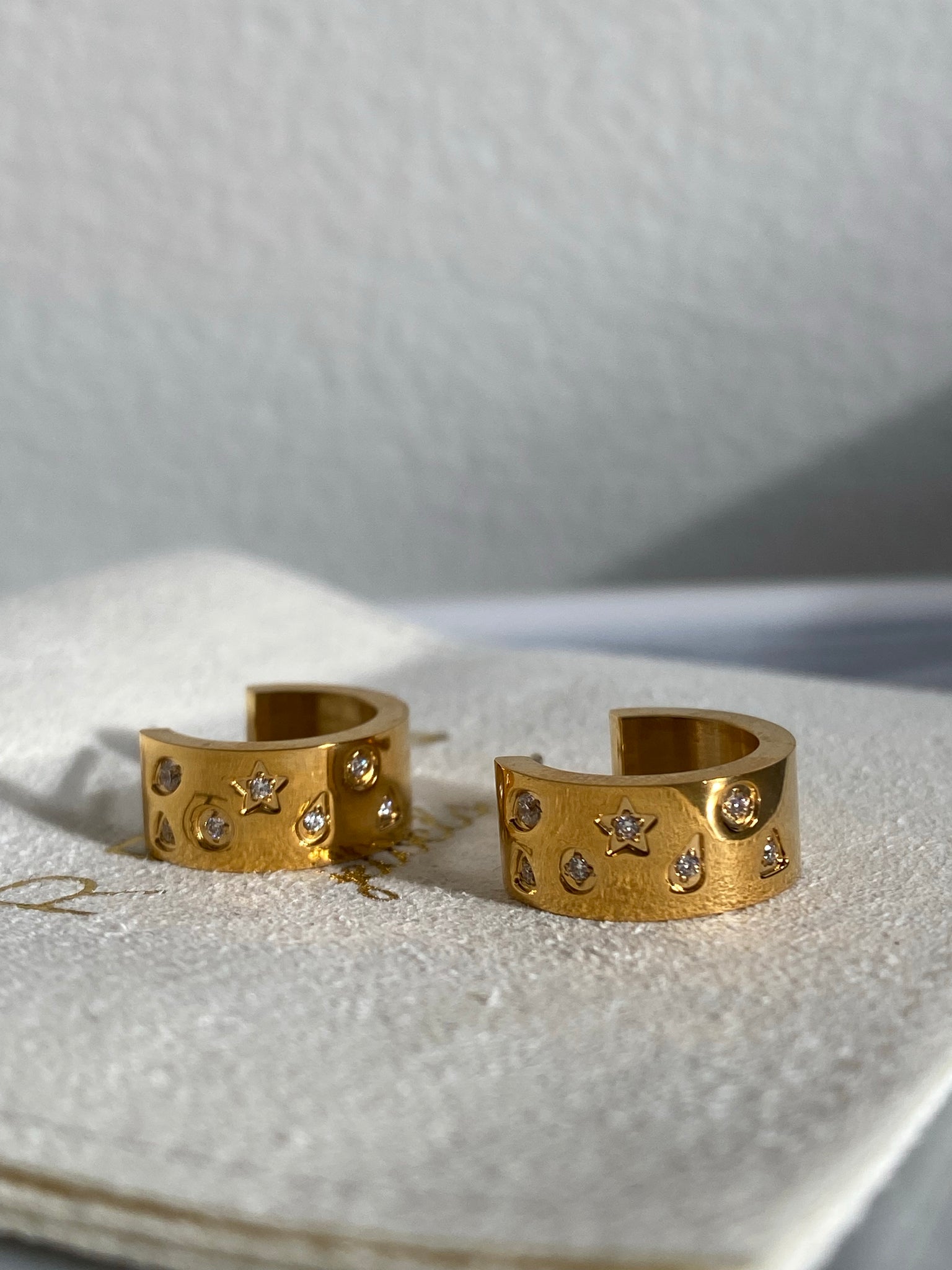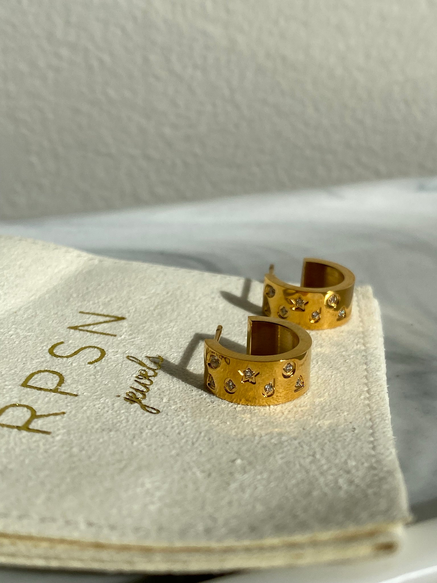 Featuring a wide, open hoop encrusted with tiny little cubic zirconia stars and moon. Show off your ear stack with Jules along with your favorite huggie hoops for that chic and trendy look. Perfect for everyday wear.