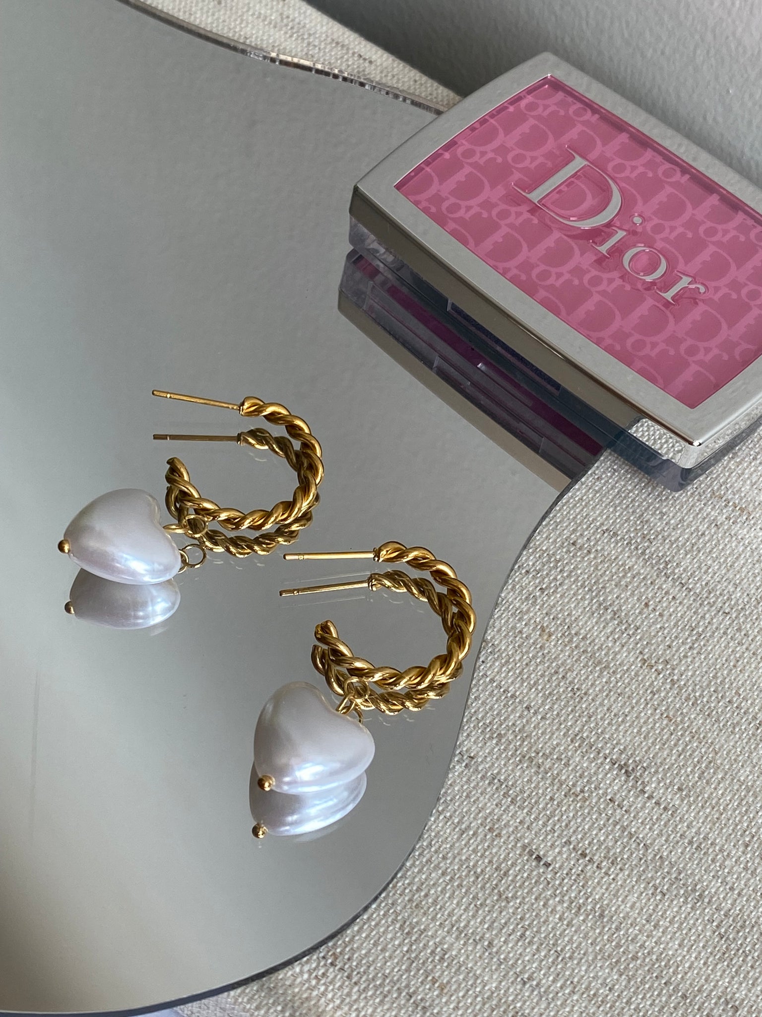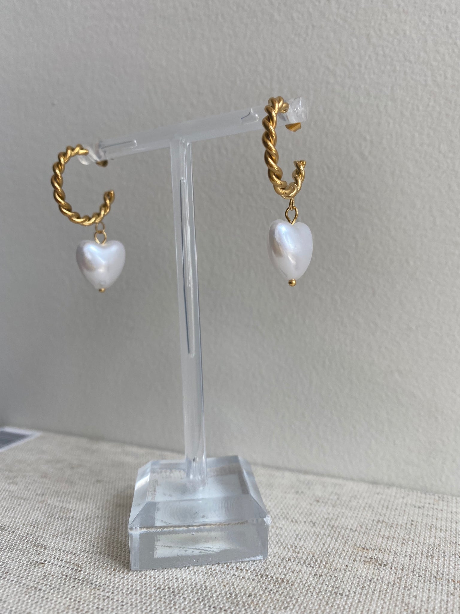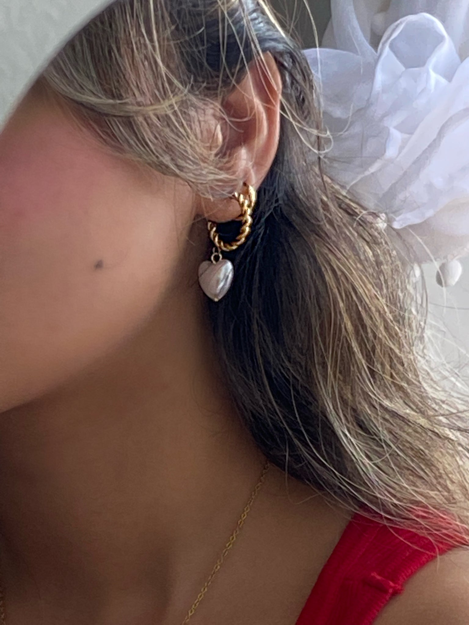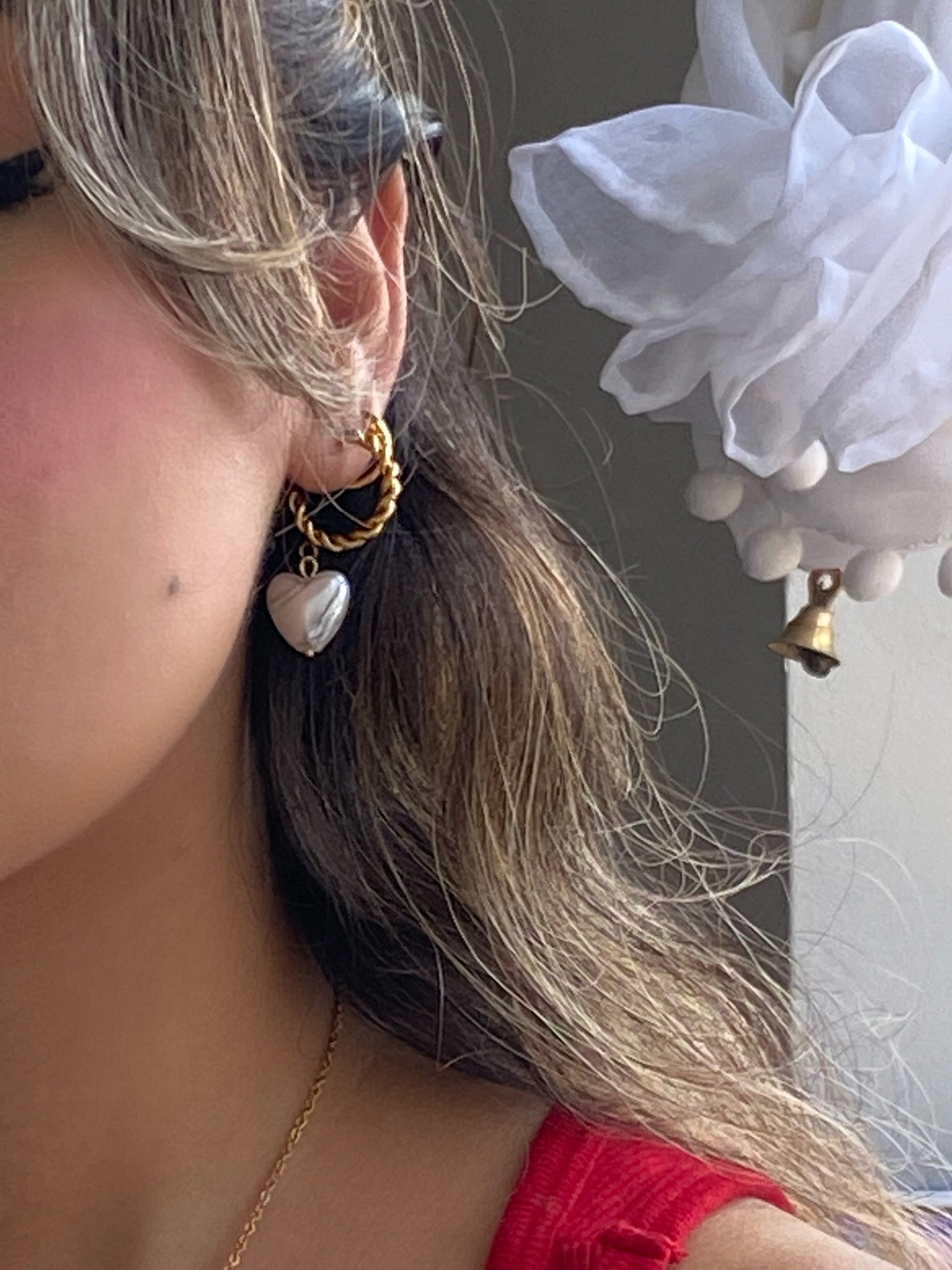 These fun and unique hoop earrings feature a twisted chunky hoop with a dangling pearl heart charm for an extra flair.